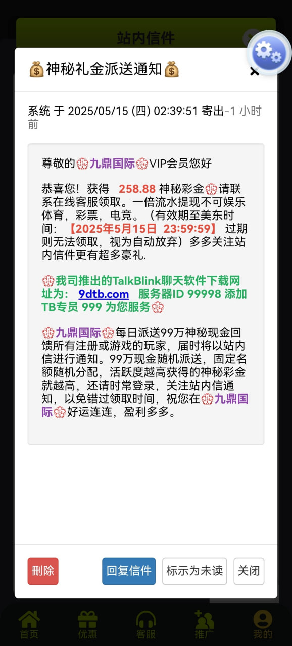 上去站内信一看有258.88链接9D.cc