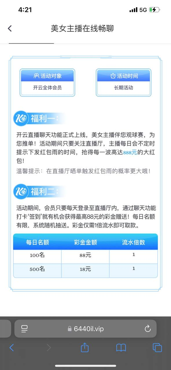 开云现在有直播 前两天去看了 今天就有18彩金,大家有号的去看直播聊天发送签到即可,还有回归彩金出了500