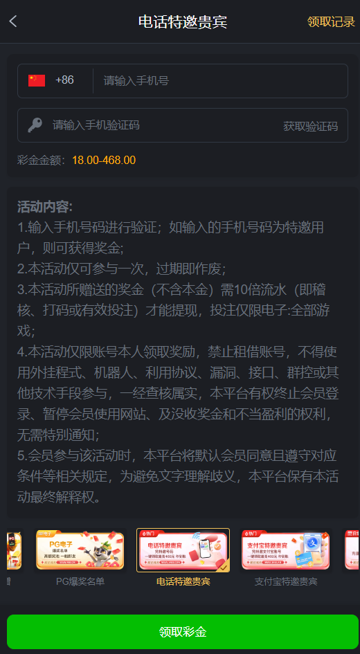 注册绑定手机号活动自助领取特邀秒到,彩金限制自行查看