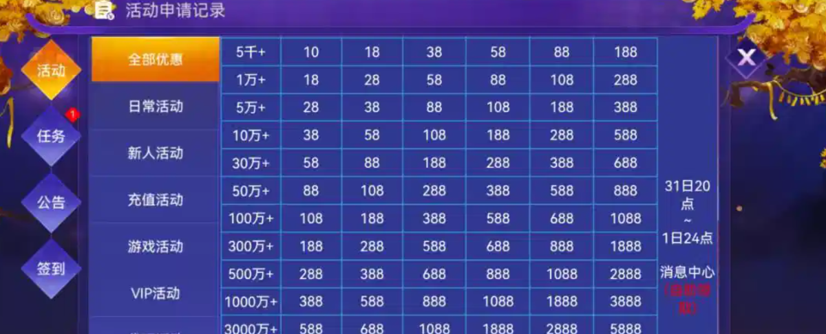 网址 696.tc 历史充值过的今天晚上8点可以领回馈,领多少看图,没充值过的不用去了,另外如果优惠封了去发邮箱反馈,我原来是捕鱼以小博大的时候给的彩金老打棋牌被封了优惠,后来自己发邮箱反馈申诉,发了邮箱之后让我充值打活跃度我就没吊他,结果隔了一段时间上去就自己解开了