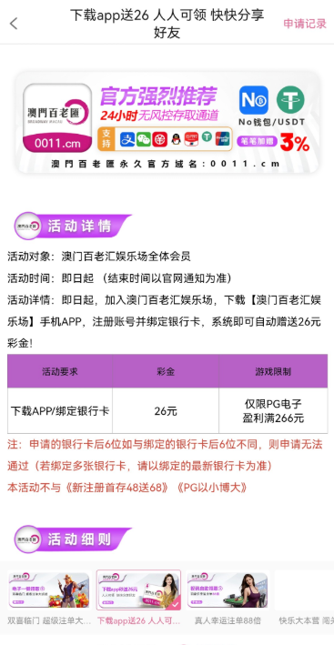 下载注册以后综合活动一直往下滑就看到了这个需要充值任意一笔我存了10申请到了0011.cm