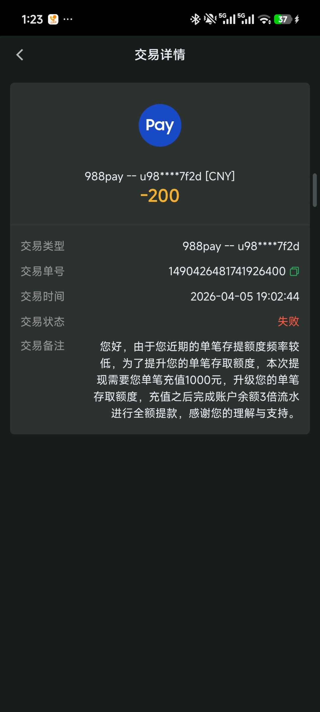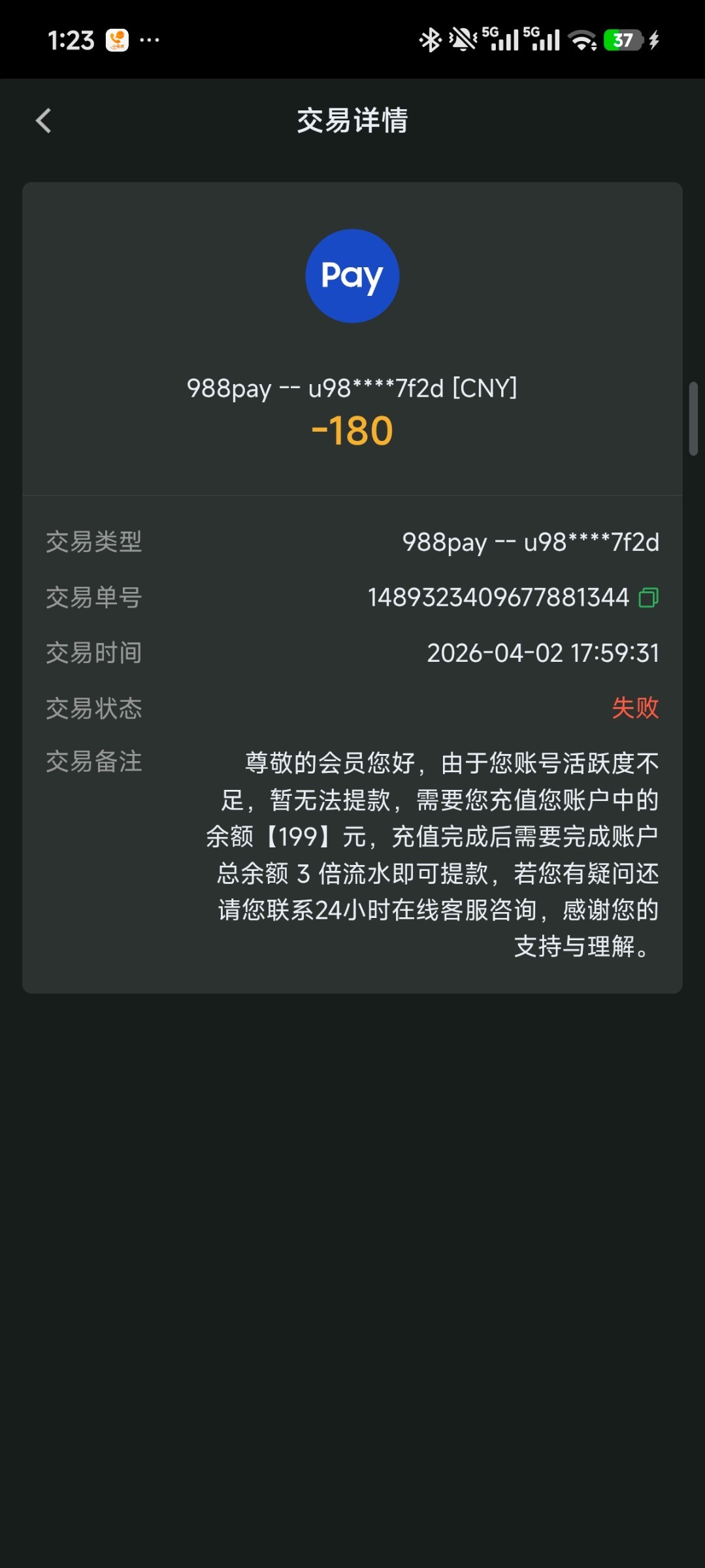 领到38特邀打到200,提款失败,联系客服,要求充值同等余额金额,打够3倍流水才给提,充值200后打够流水,余额来到1800,申请提款失败,说账号活跃度不够,要求充值1千再打三倍流水,这就是个黑平台,各位老哥避坑!