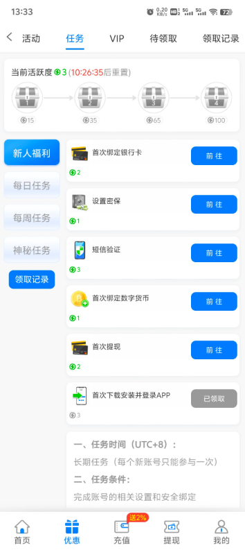 完成手机验证和新人任务都能领彩金