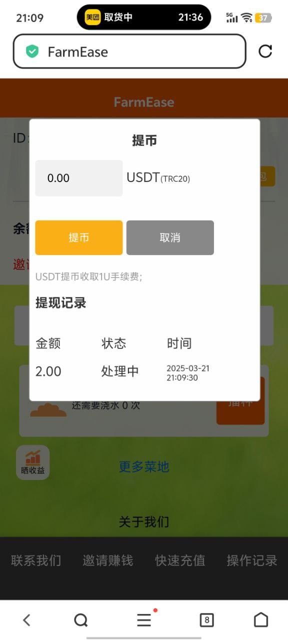 注册首页浇水自助领取2u,可直接领取,需要1u手续费